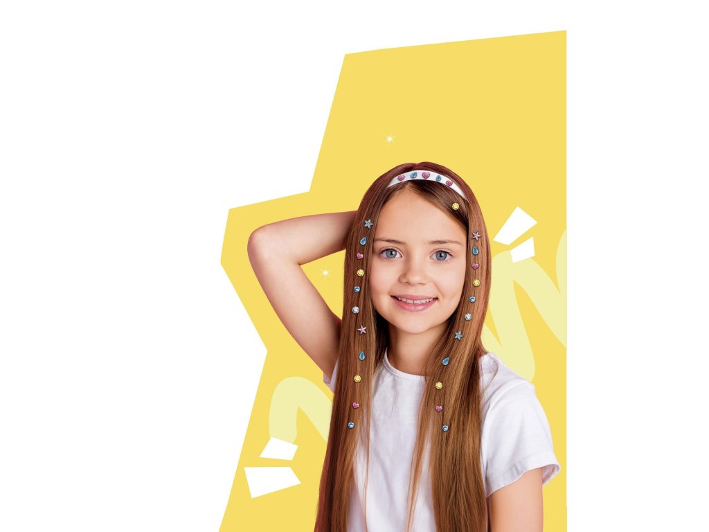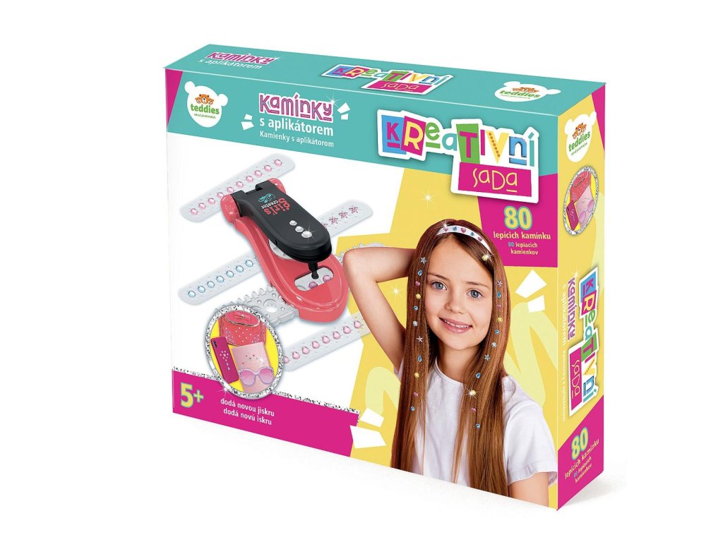Kreativní sada obsahuje aplikátor a 80 lepicích kamínků, kterými si děti mohou ozdobit nejen vlasy, ale i deník, pouzdro na mobil, peněženku…