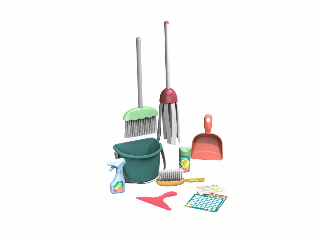 Úklidová sada obsahuje 10 komponentů- smetáček a lopatku, smeták, mop, kýbl, čistící prostředky a další. Výrobek je vhodný pro děti od 3 let.