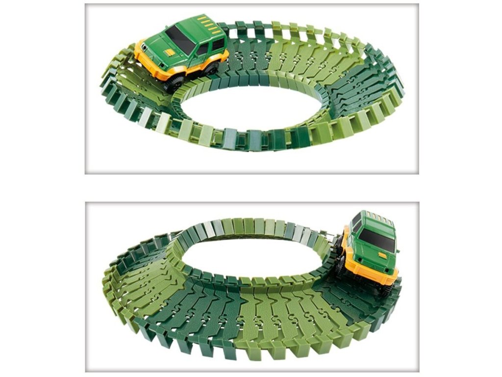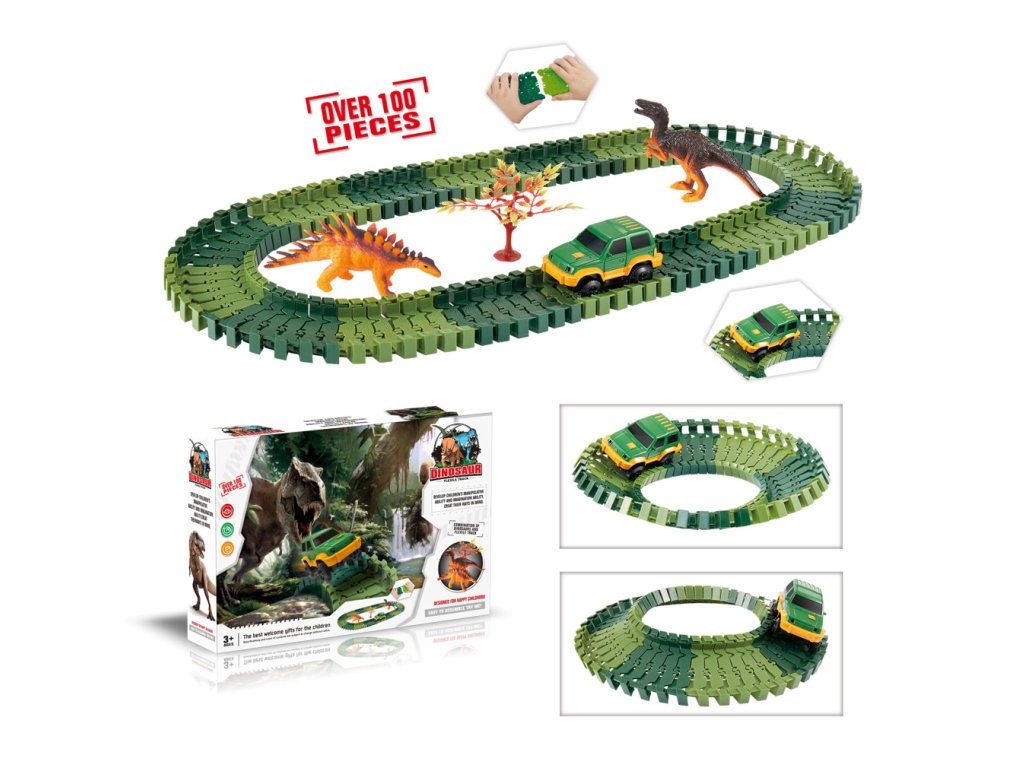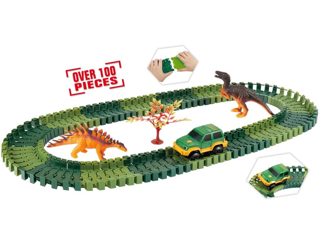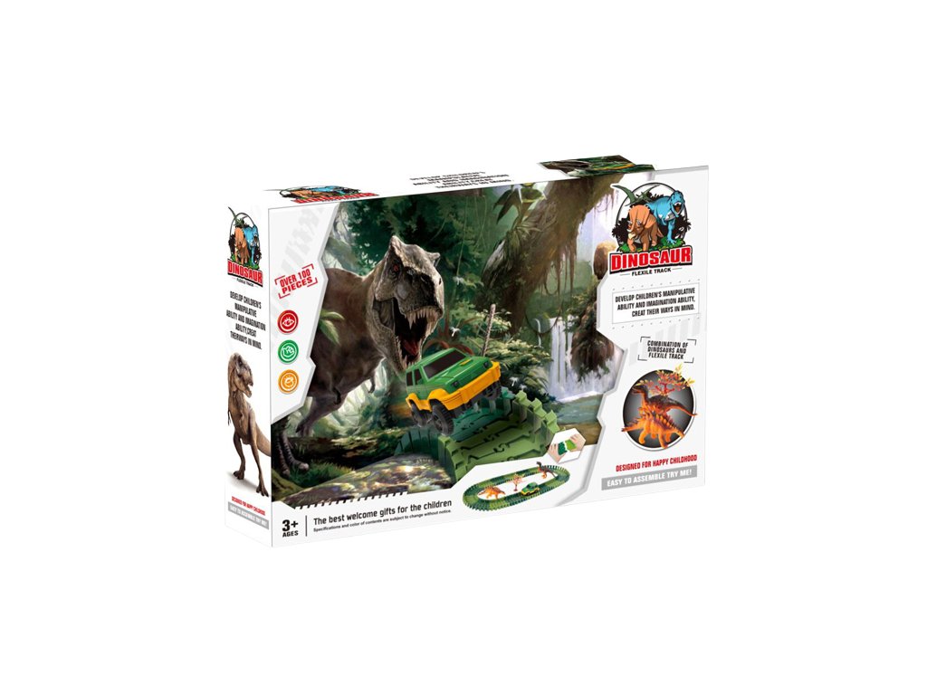 Balení obsahuje: variabilně sestavitelnou dráhu, 3 pravěká zvířata, strom, svítící autíčko 9,5 × 5,5cm. Provoz autíčka na 2×1,5V AA baterie – nejsou součástí balení.