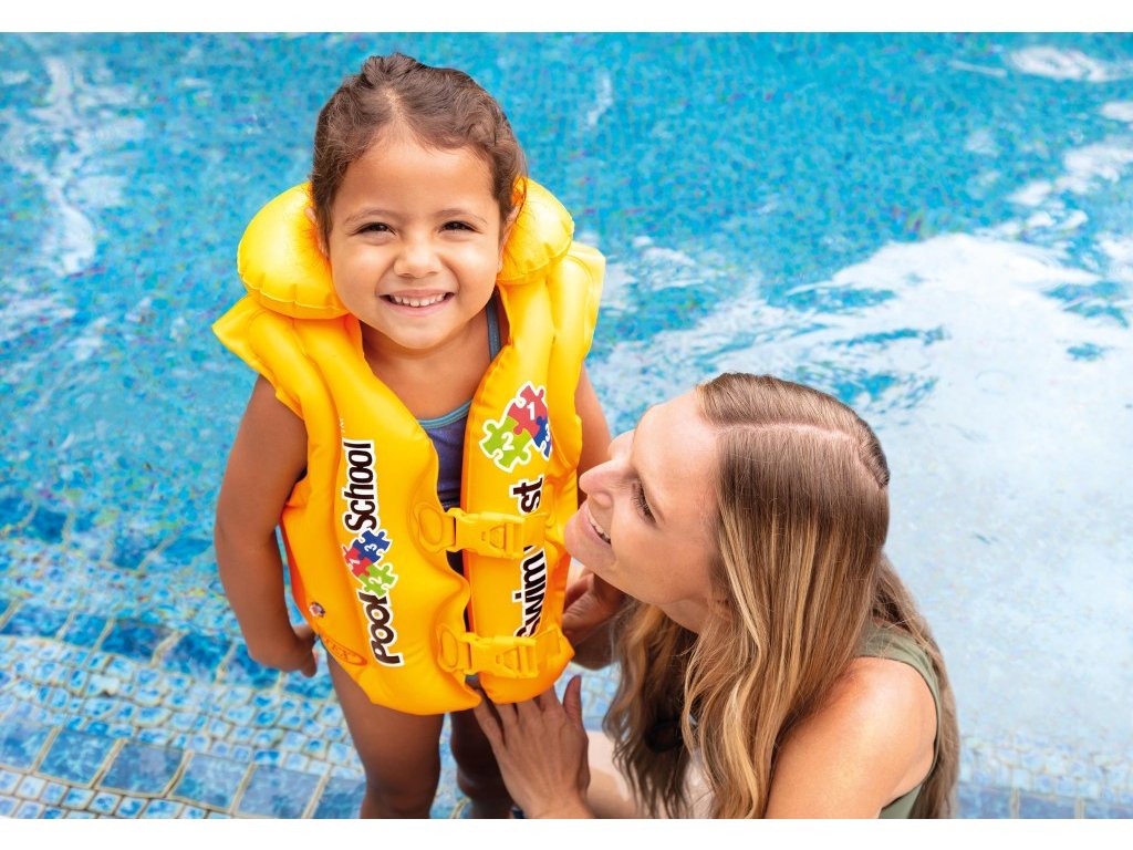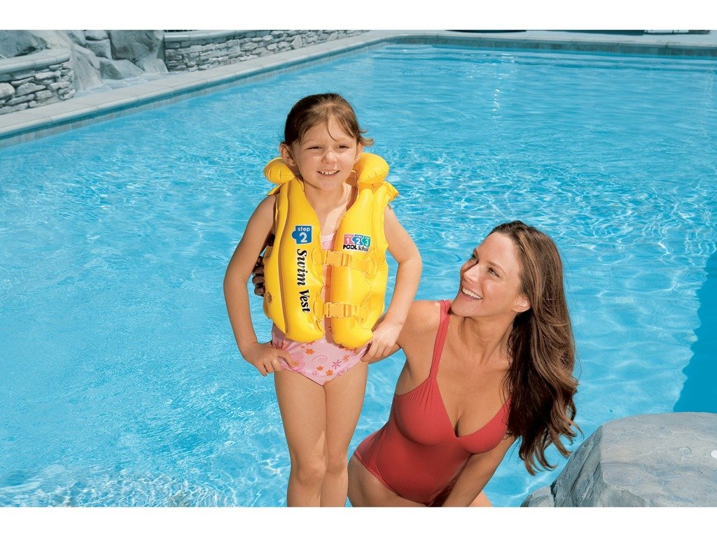 Dětská nafukovací plavací vesta pro bezpečnost dětí s pohodlným límcem a dvěma nastavitelnými přezkami ve žluté barvě. Vesta má třikomorový systém a zpětný ventilek. Doporučeno pro děti ve věku 3–6 let. Velikost 50cmx47cm