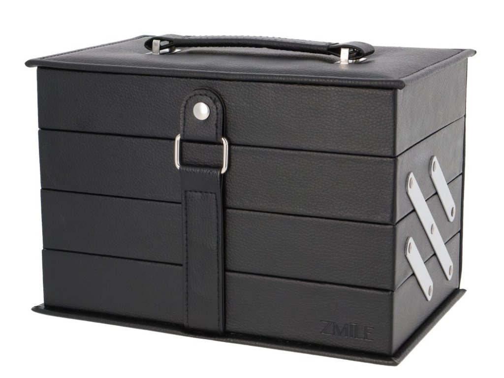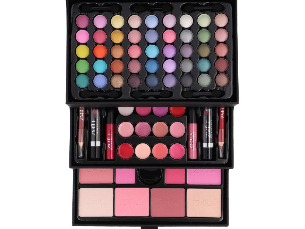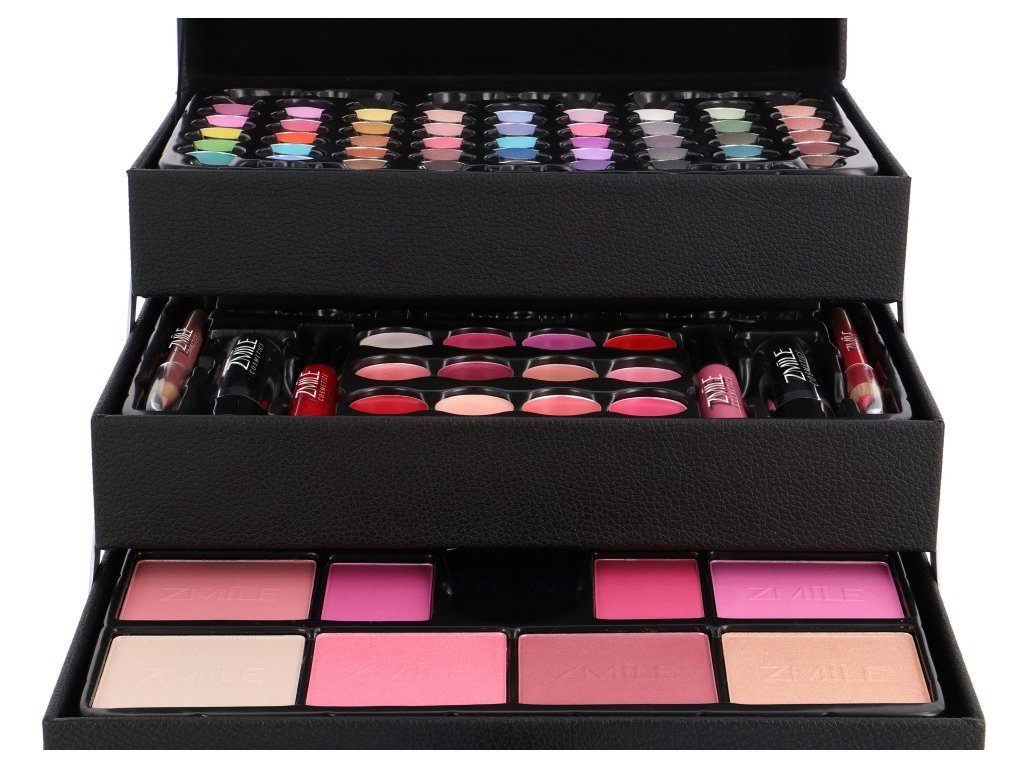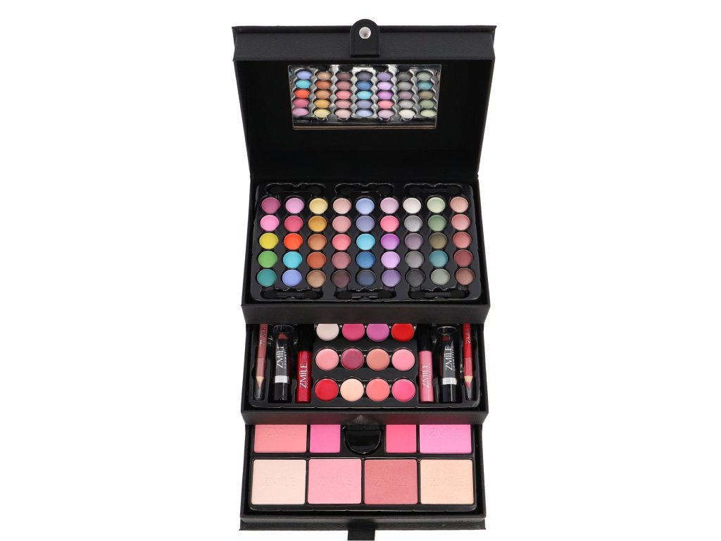 Kosmetický kufřík kožený Beauty Case Black – kožený černý – celkem 82 ks příslušenství. Obsahuje 45× očními stíny, 12× krémový lesk na rty, 8× tvářenka, 2× lesk na rty, 2× rtěnka, 2× tužka na rty, 1× sada 10 ks štětců a aplikátorů, 1× integrované zrcátko.Dermatologicky testováno, vyhovuje přísným normám EU.